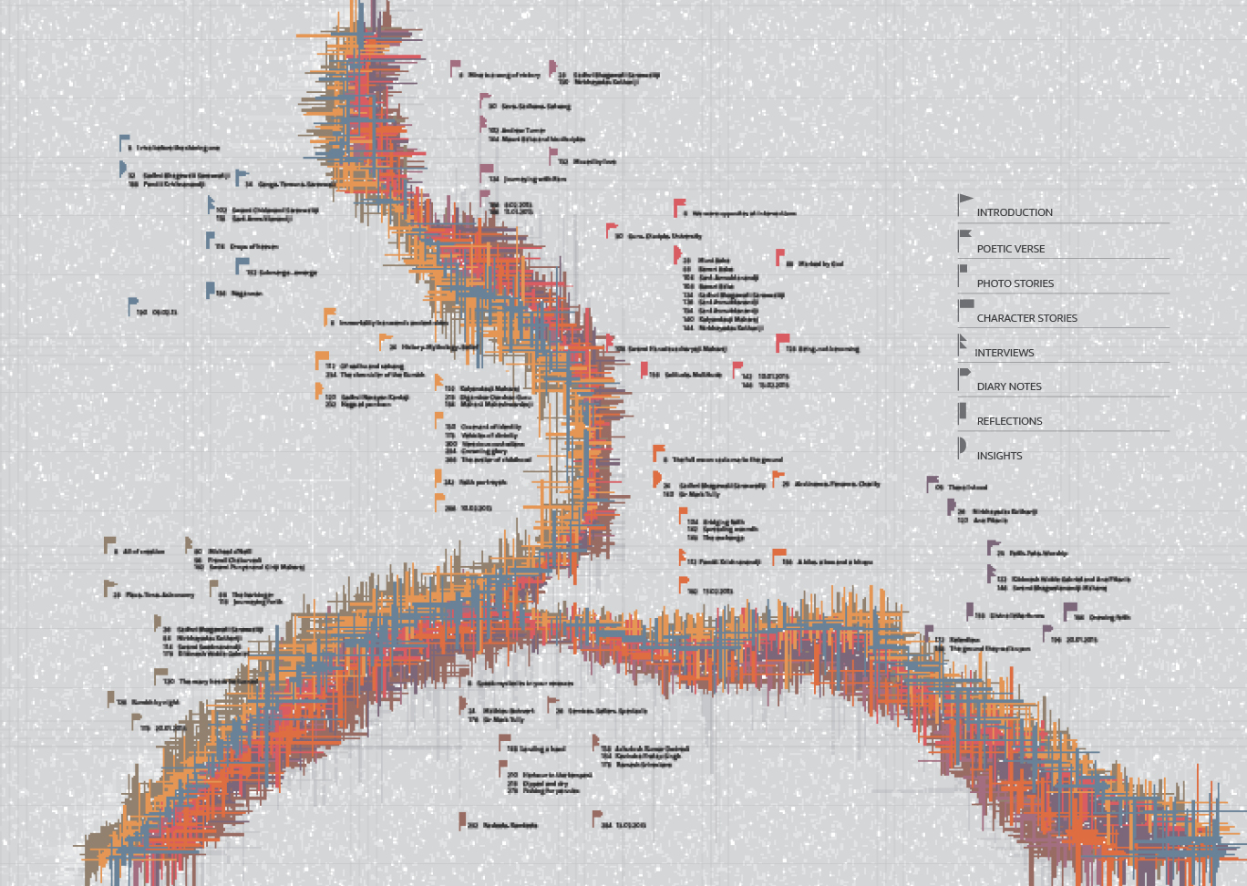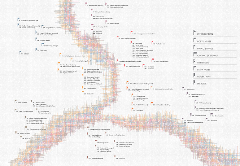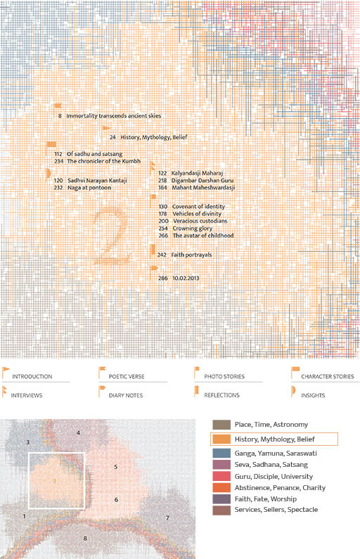 The maps below anchor the information architecture designed to navigate 8 volumes spanning 1500 pages that form Being in it and being of it. The visual contours of the map mimic the geographical map of Sangam at Allahabad where the three rivers (the Ganga, the Yamuna and the Saraswati) meet. However, the areas demarcated using colour within the map along with position markers bearing flag symbols have no real geographical connection with the on-field layout of the Kumbh Mela. The usage of the map is contextual for and within the framework of the book; functioning as a visual intervention to steer the flow of the layered content. This system finds its application and usage in the footers of all the pages within the books; thus helping to orient appropriately while on any page of the book.